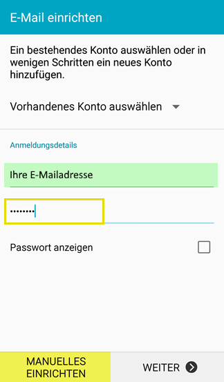 - Wählen sie das E-Mail Symbol aus, tragen sie ihre Mail-Adresse und ihr Passwort ein und klicken sie im Anschluss auf die Option “Manuelles Einrichten”.