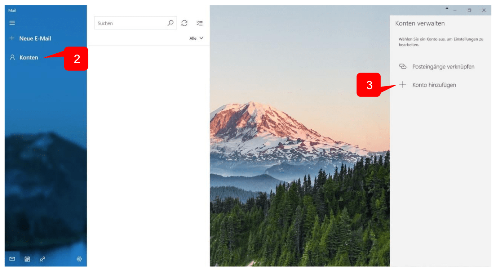 Öffnen Sie das Programm “Windows 10 Mail” und wählen im Menü oben links “Konten” aus.