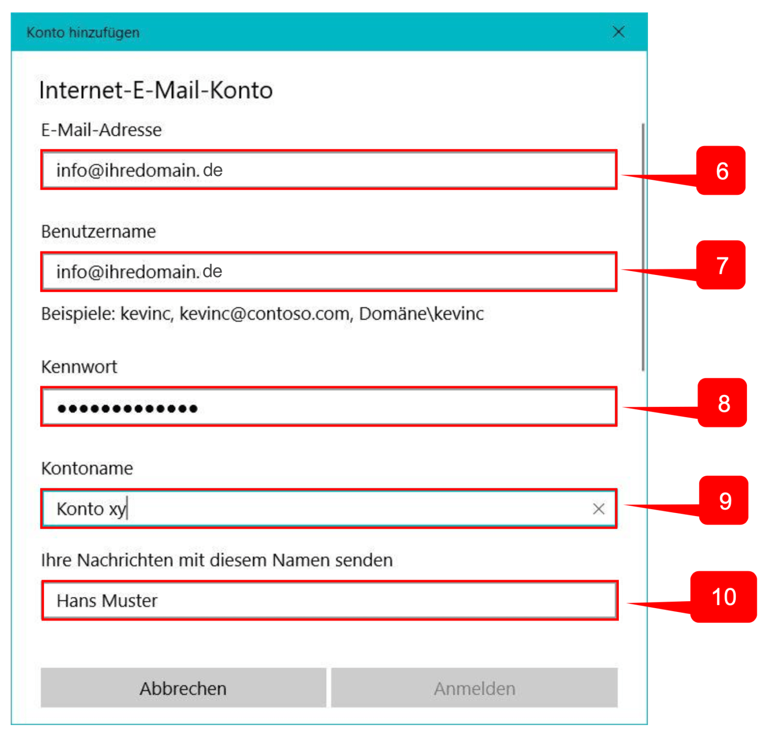10. Hier geben Sie den Namen ein, welcher bei anderen Personen angezeigt werden, wenn diese eine E-Mail von Ihnen erhalten.
