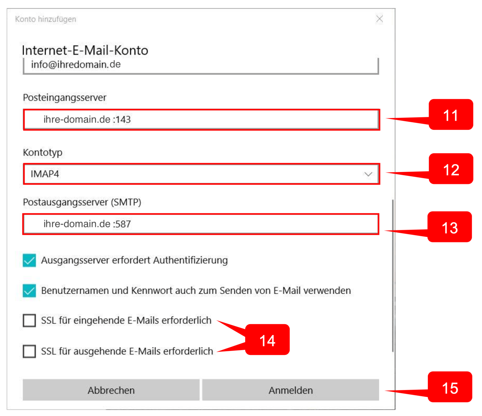 13. “Postausgangsserver”: Verwenden Sie hier bitte Ihre Domain-Adresse. Also Ihre Webseite z.B.: ihre-webseite.de und dahinter :587